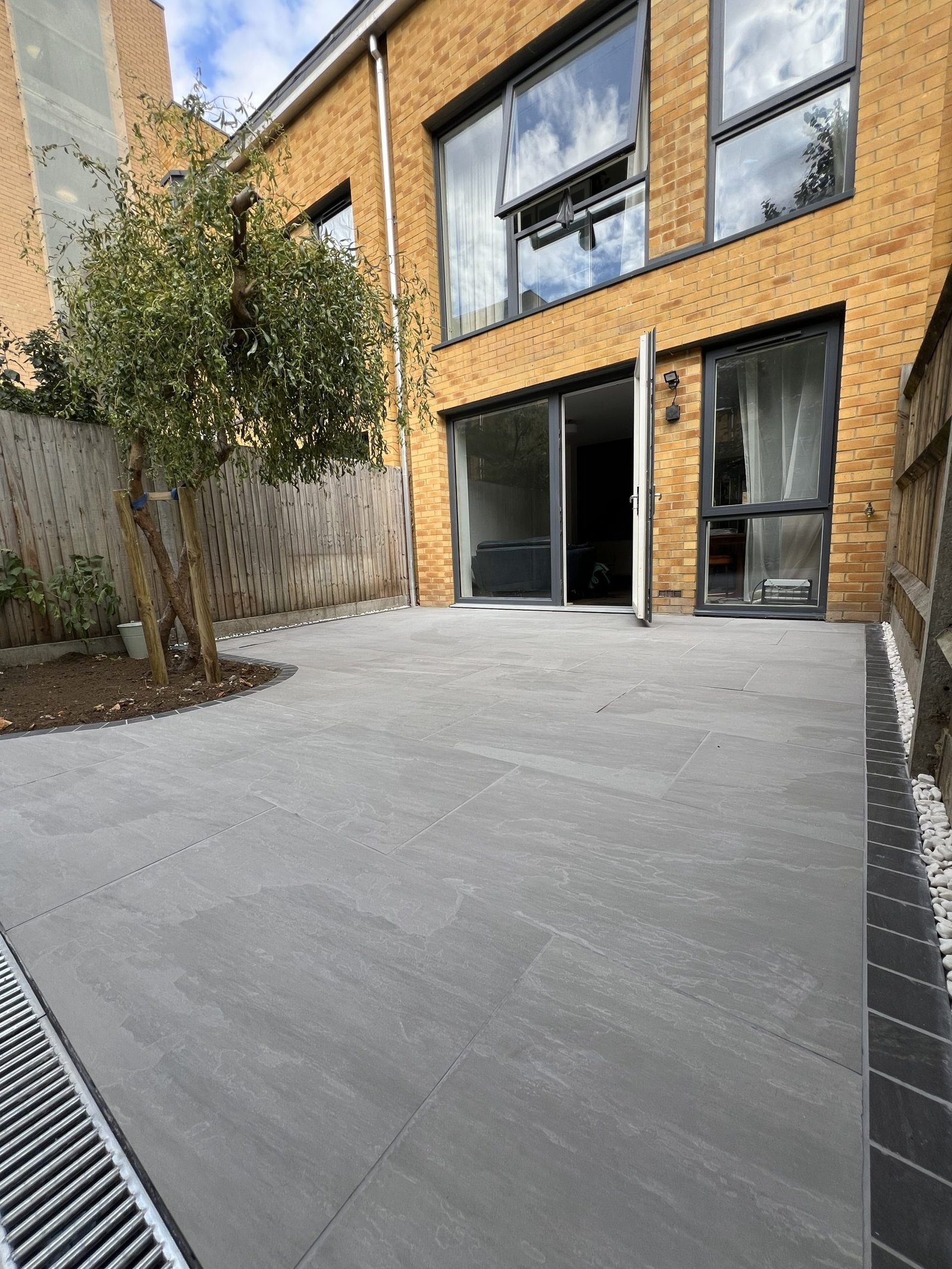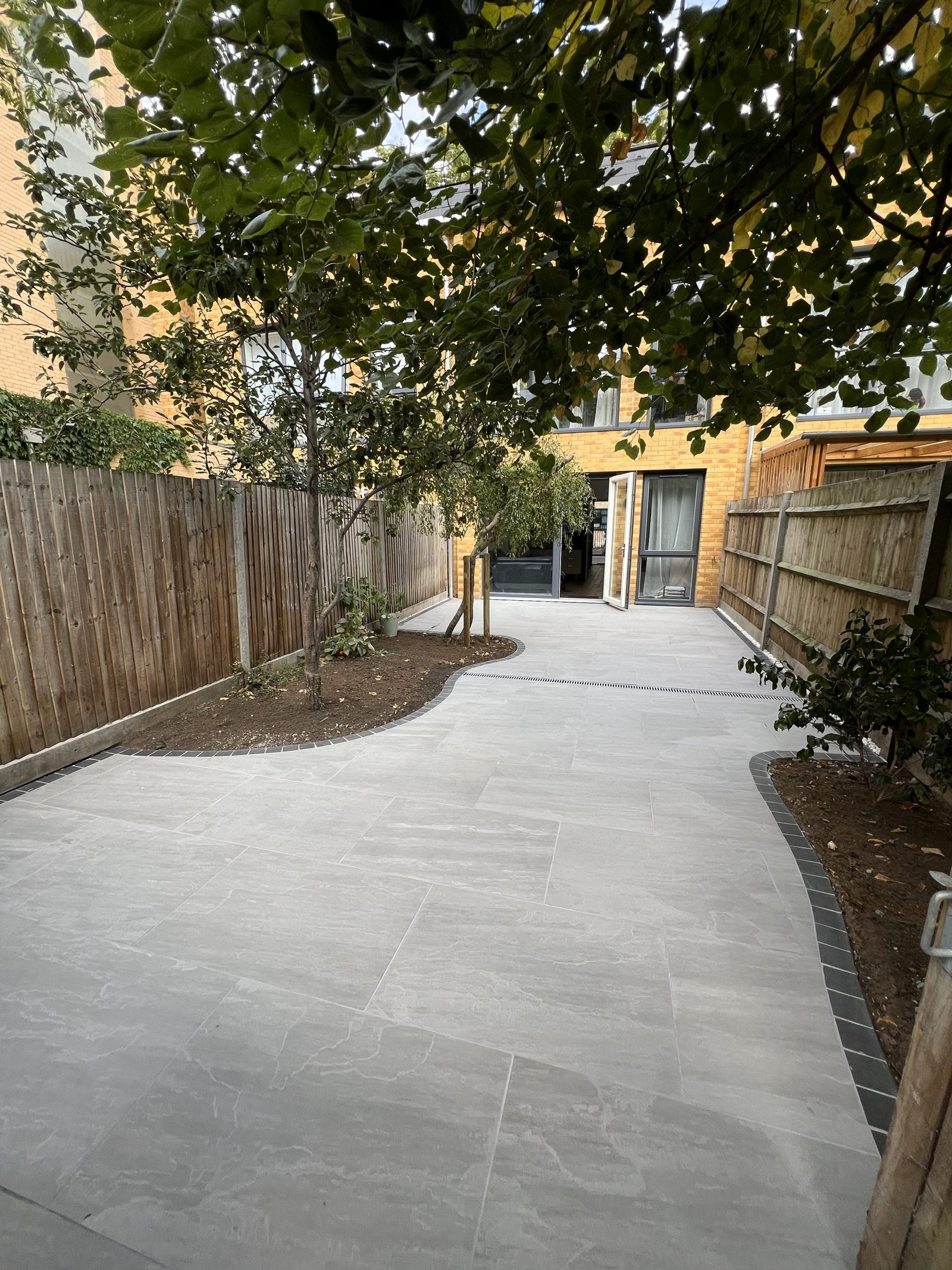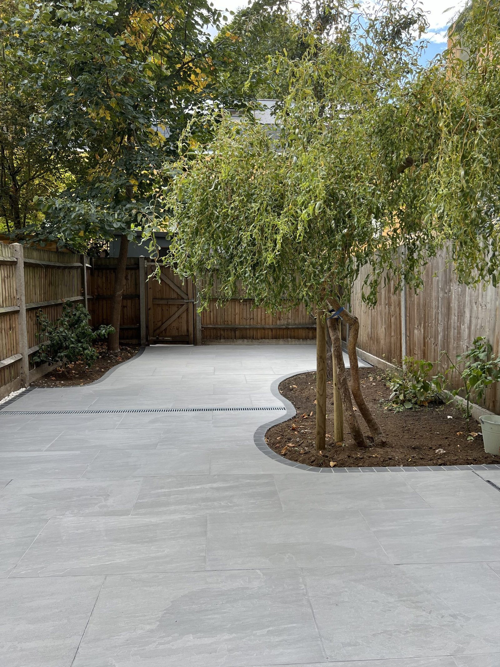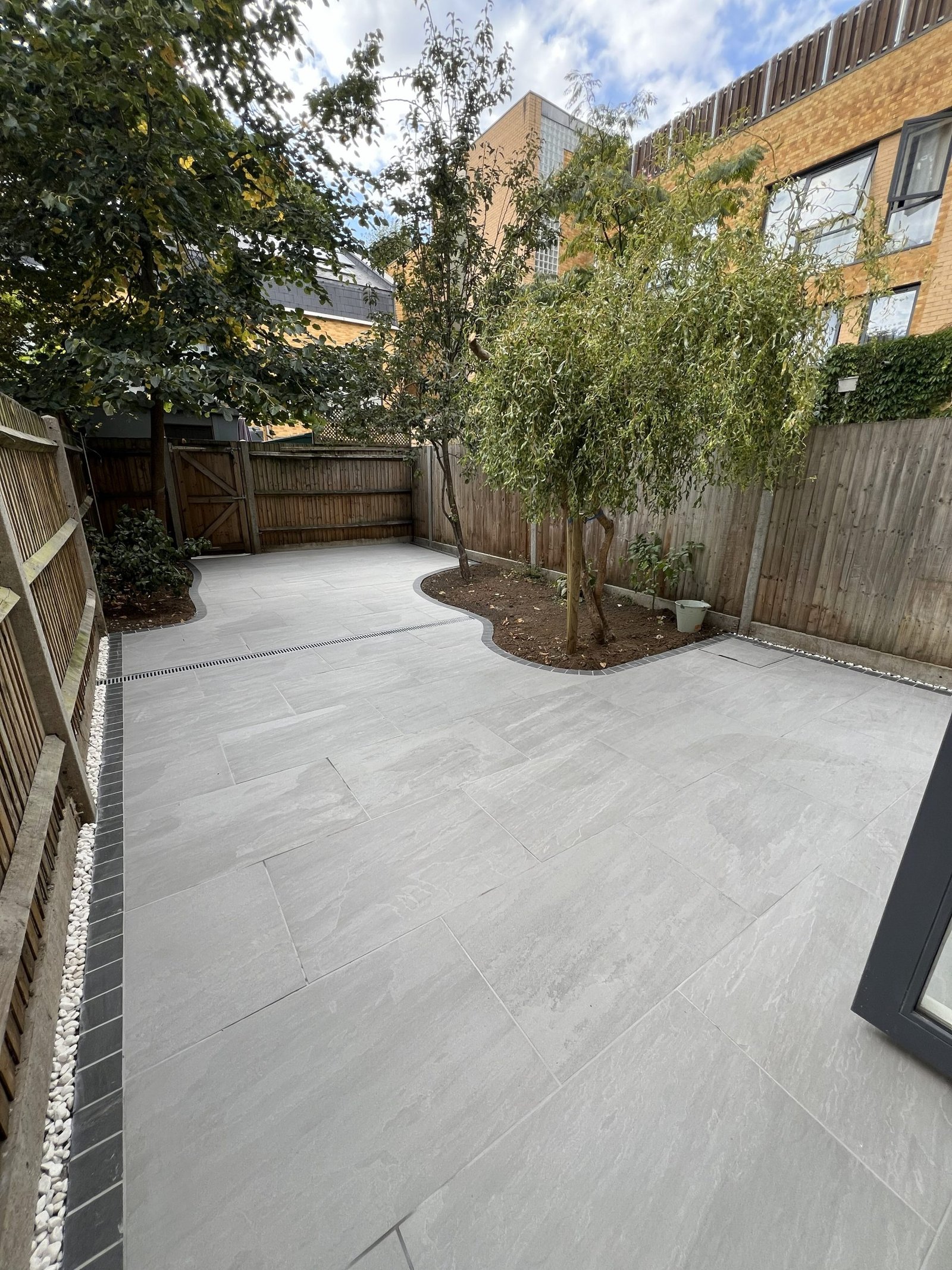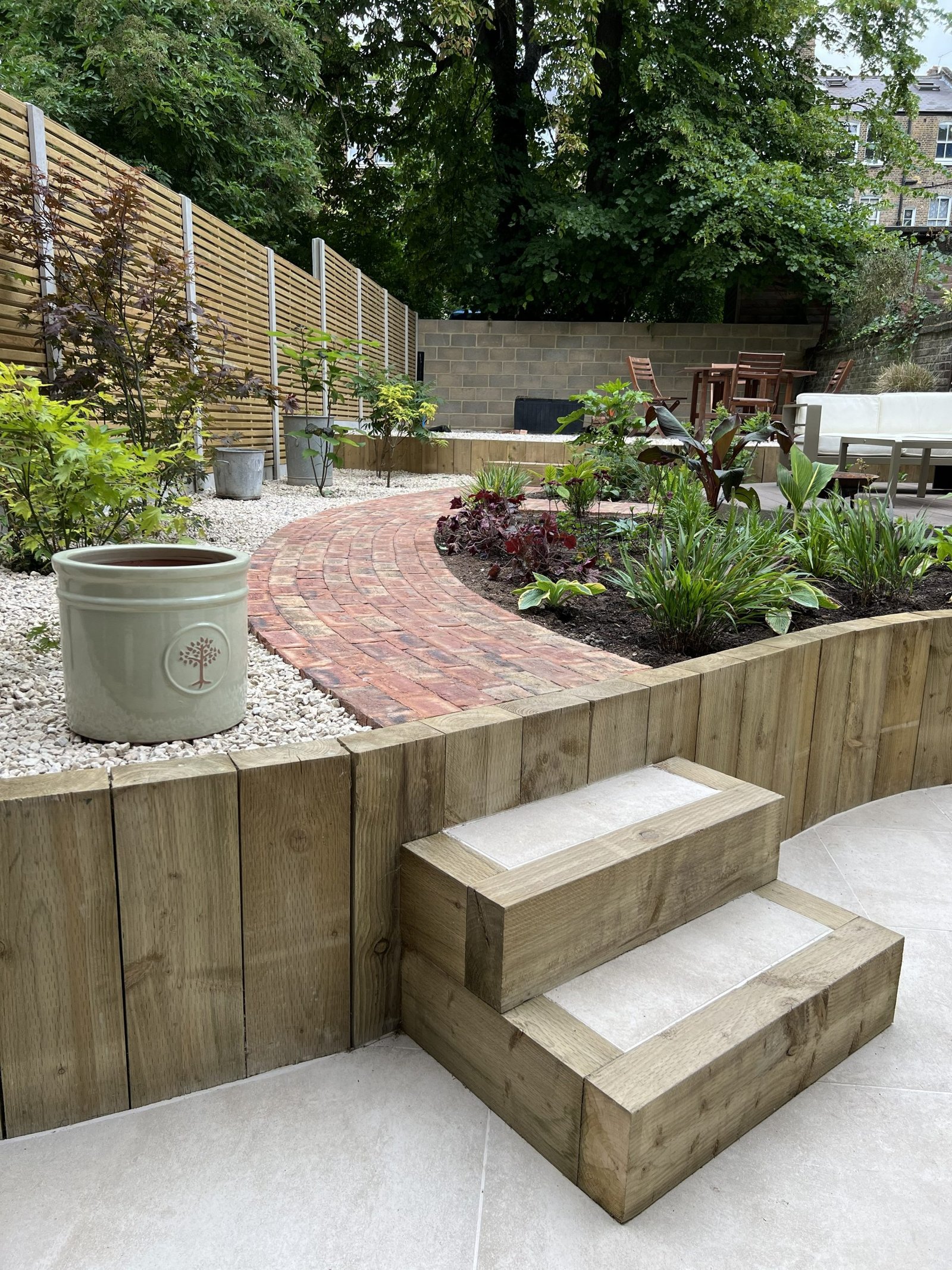 Despite the challenging access, our team completely transformed this garden into three beautiful levels. Using sturdy wooden sleepers to create retaining walls for each tier. The first level features a premium Italian porcelain patio. The second combines brick paving, composite decking, gravel & topsoil. Third level is finished with gravel, ready for a future garden room. The project was completed with a modern double-slatted fence set on concrete posts and gravel boards, giving the entire space a clean and contemporary finish.