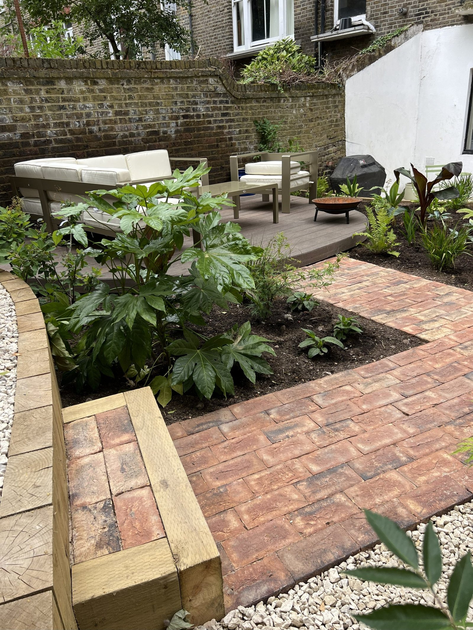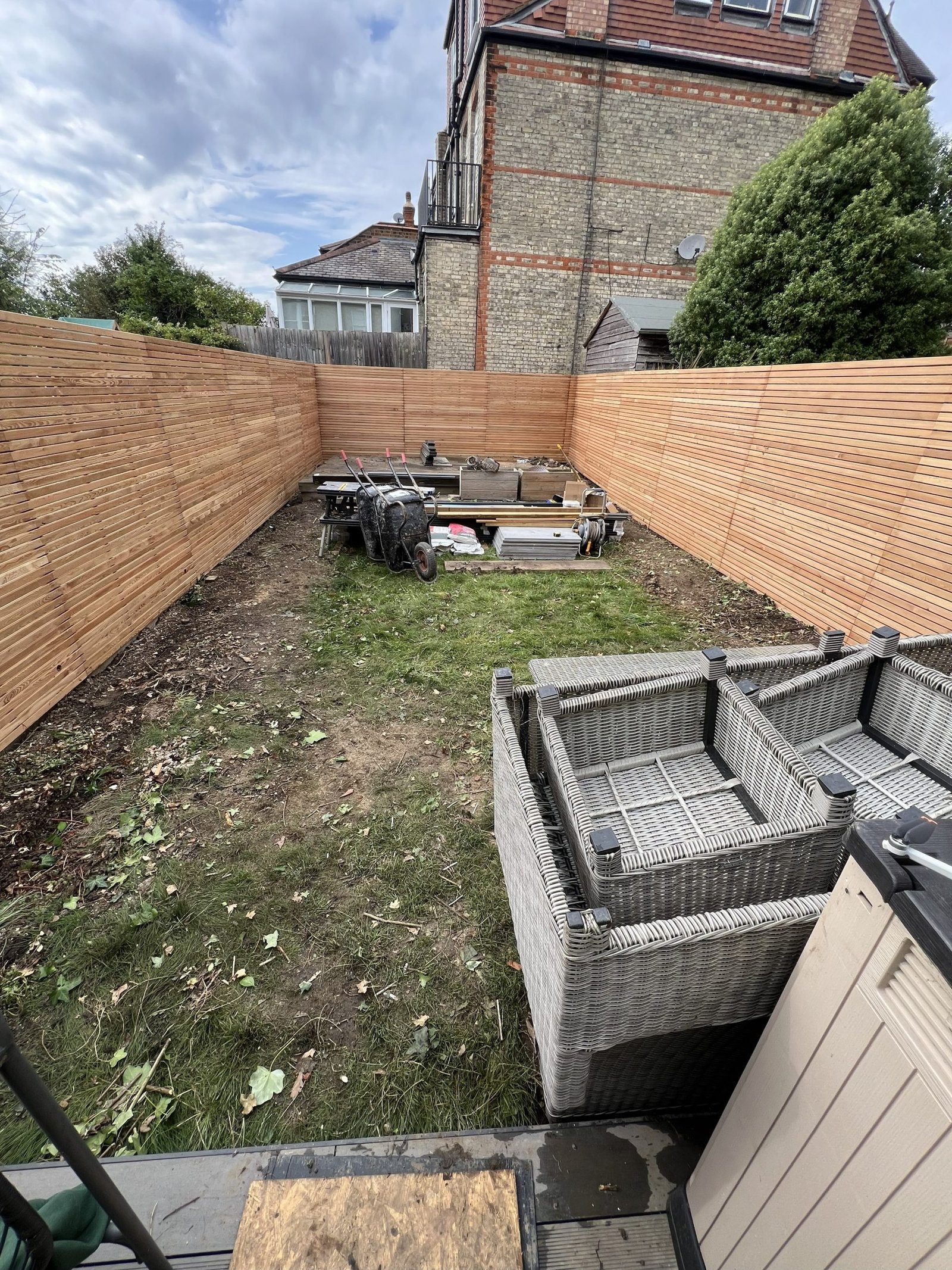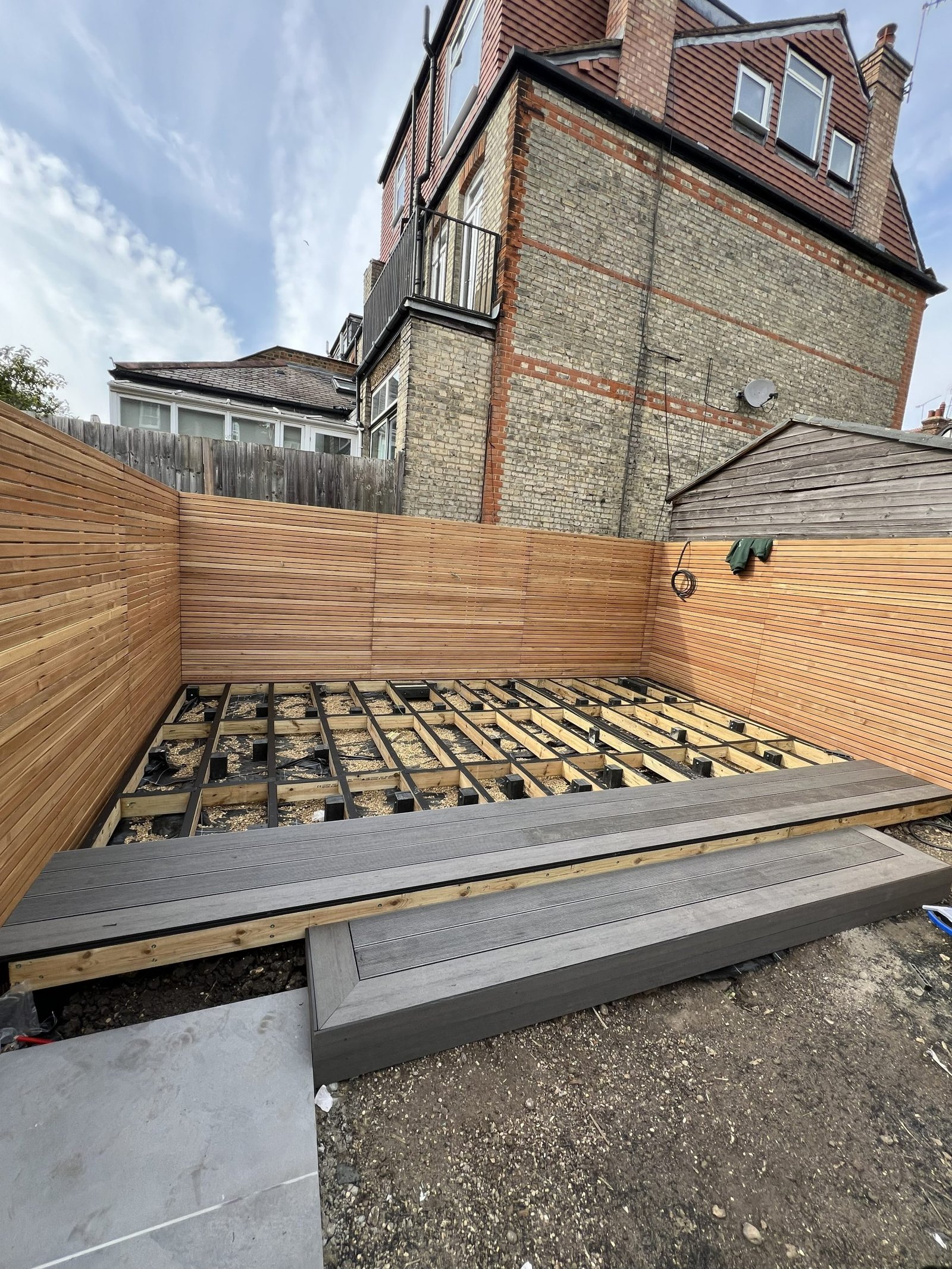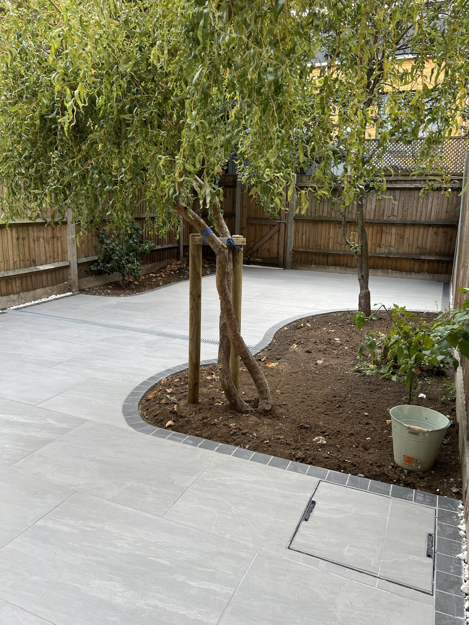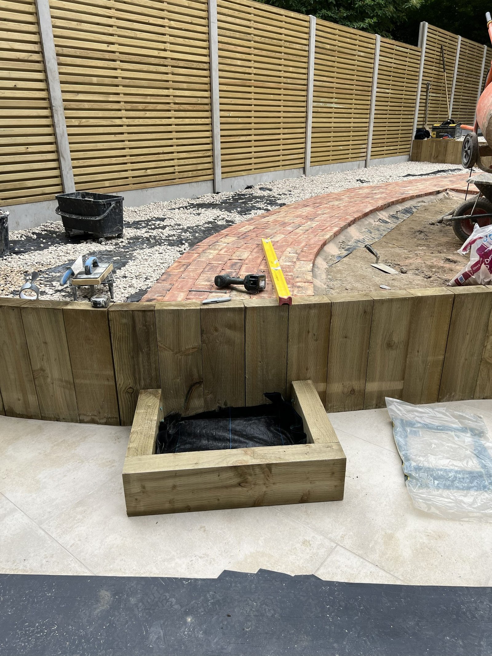 Despite the challenging access, our team completely transformed this garden into three beautiful levels. Using sturdy wooden sleepers to create retaining walls for each tier. The first level features a premium Italian porcelain patio. The second combines brick paving, composite decking, gravel & topsoil. Third level is finished with gravel, ready for a future garden room. The project was completed with a modern double-slatted fence set on concrete posts and gravel boards, giving the entire space a clean and contemporary finish.