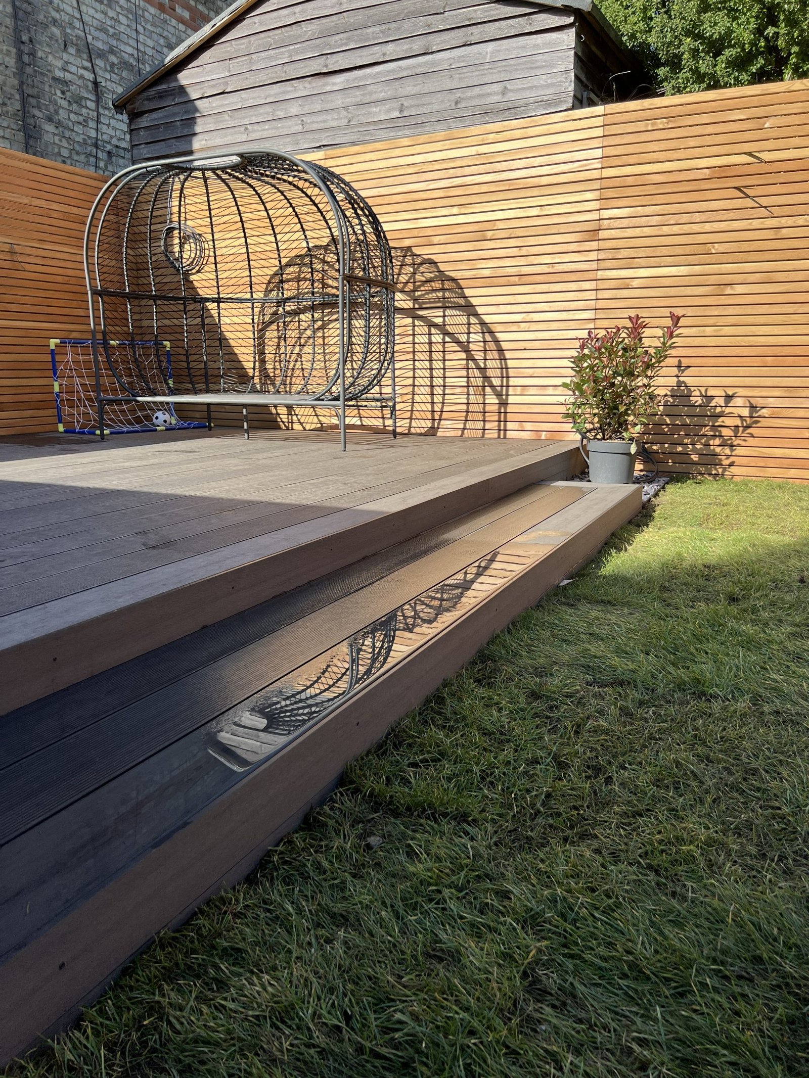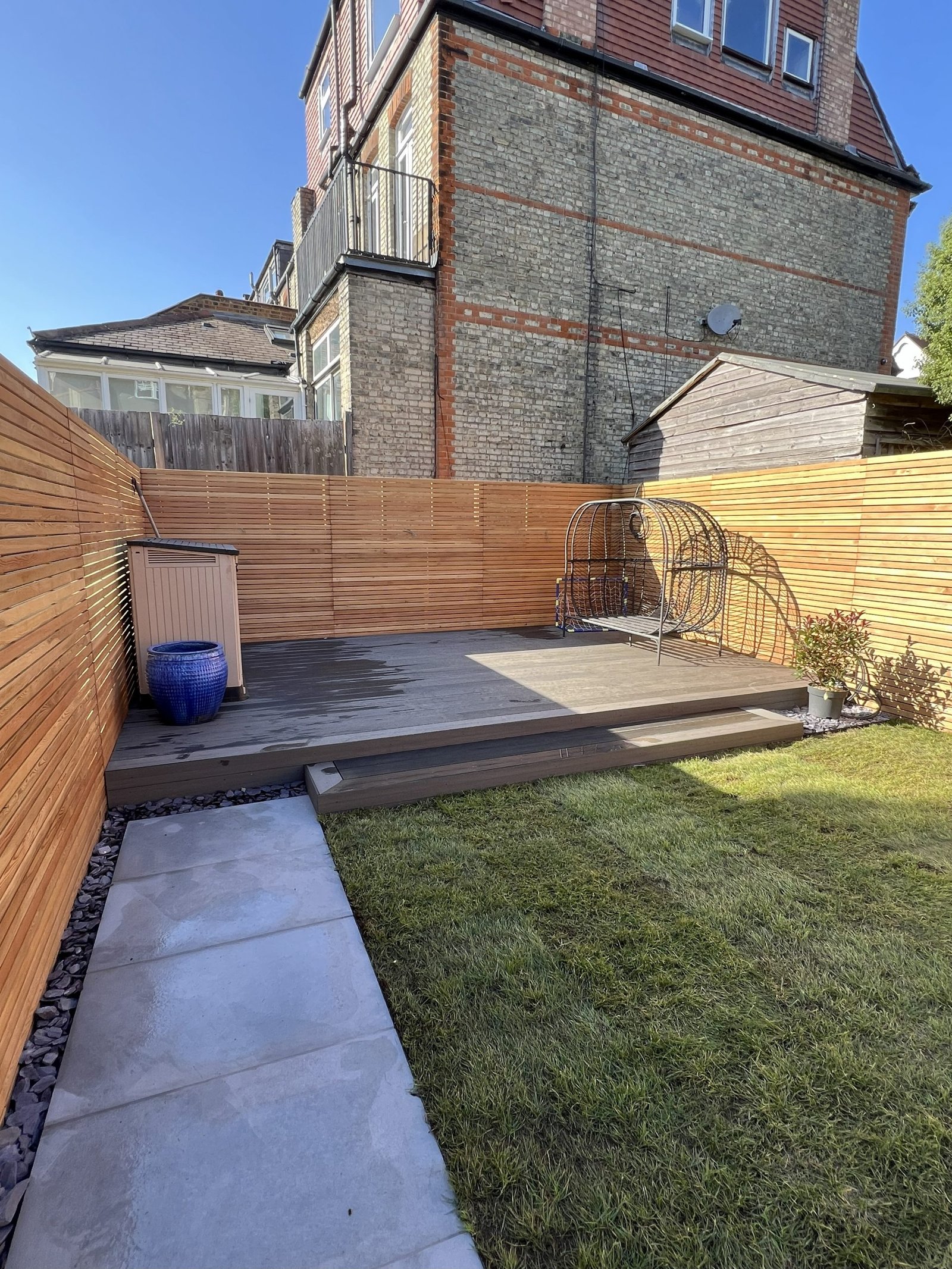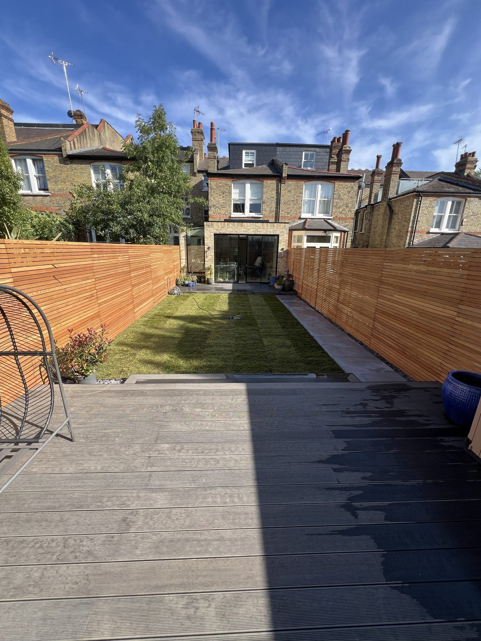 Working closely with an architect, we transformed this outdoor space into a beautifully balanced design that combines style, durability, and premium materials. The project features elegant Italian porcelain paving, creating a stunning pathway that leads naturally to a brand new composite decking area. Built with long lasting composite posts, the decking is designed to stand the test of time while providing a perfect space for relaxation and entertaining. To enhance the contemporary aesthetic, we installed premium slatted fence panels for a sleek, modern finish. Finally, we laid fresh Rolawn Medallion turf, bringing vibrant colour and softness to complete this garden transformation.