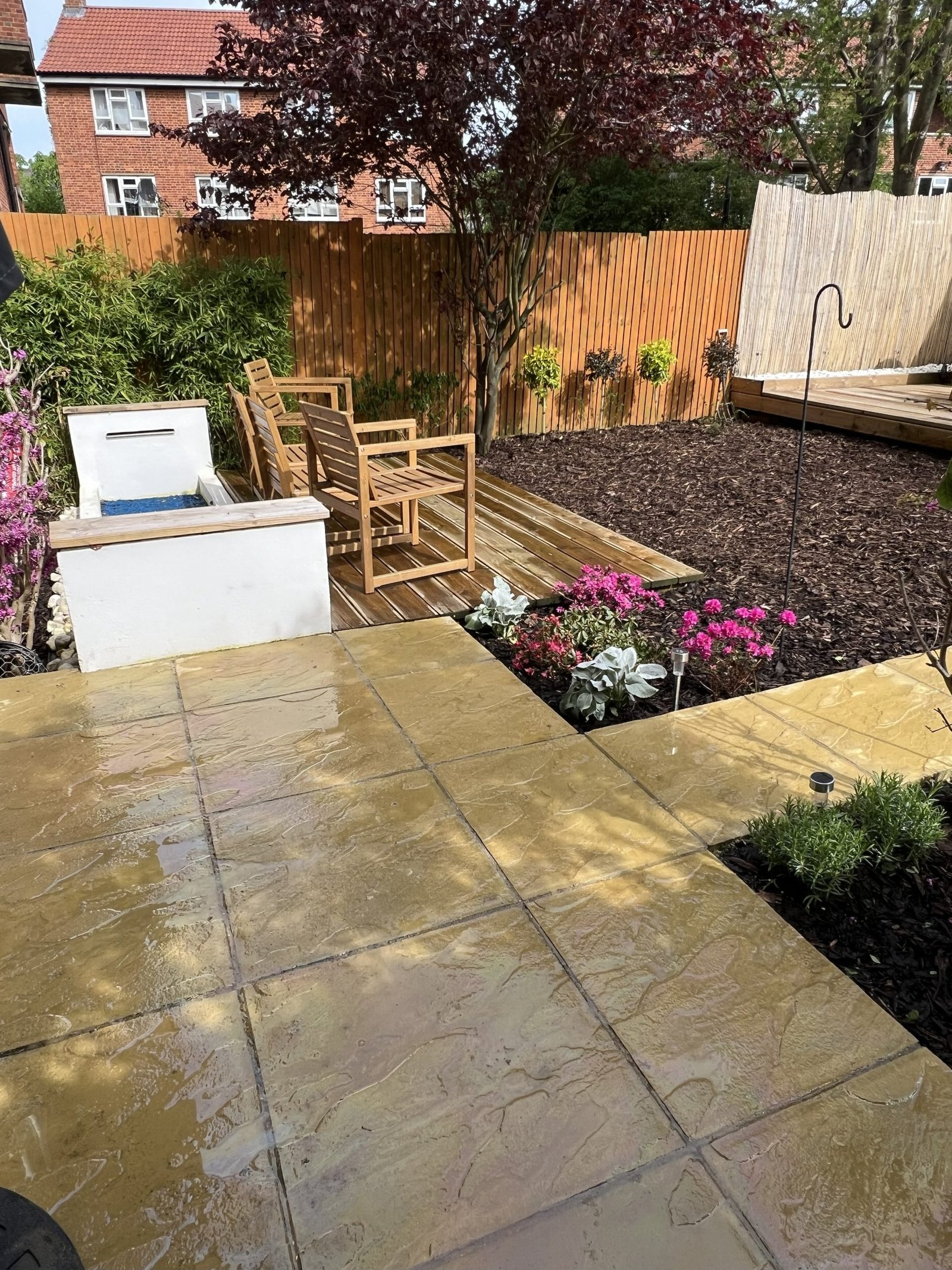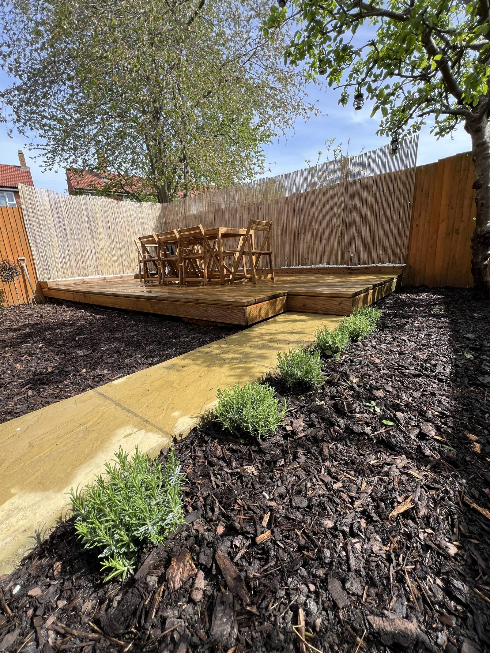 When we first arrived, this garden had lost its spark tired paving, overgrown beds, and little space to enjoy. Our goal was to revive it without losing its original character. Using stunning 45×45 paving, we rebuilt the paths and patio to mirror the garden’s previous layout, keeping its familiar flow while giving it a clean, modern finish. We then constructed two beautiful wooden decking areas, creating flexible spaces for dining and relaxation. We also did a bit of soft landscaping by adding fresh plants and bark mulch, bringing warmth, life, and natural beauty back into the space.